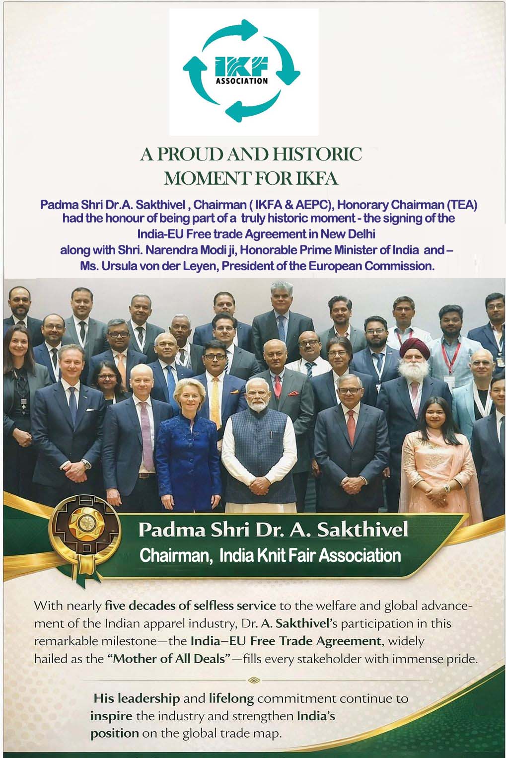 Dr. A. Saktivel, Chairman of the Apparel Export Promotion Council (AEPC) and IKFA, was present at the signing ceremony, marking a significant milestone in India–EU economic relations. Following the signing, a high-level Business Event was organised at Bharat Mandapam, where Dr. Saktivel represented AEPC and participated in discussions with key stakeholders from government and industry.